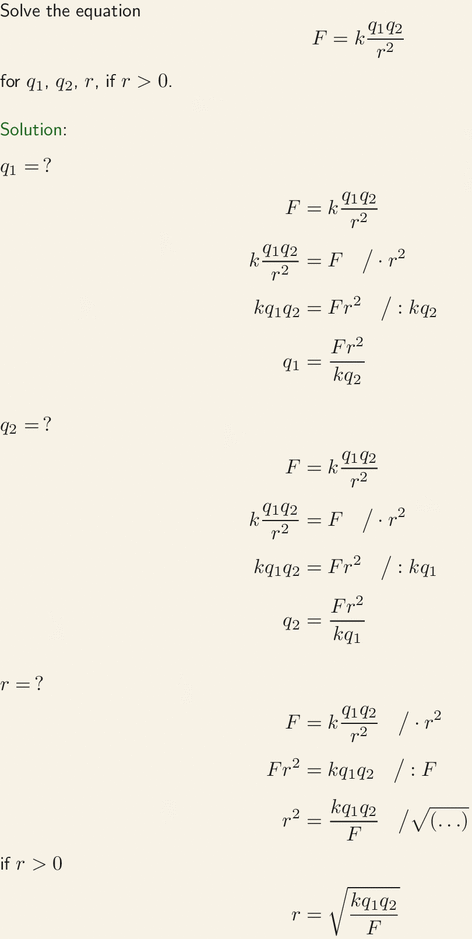 Find from Coulomb's law's equation quantity of point charges q_1, q_2 and distance r between them.