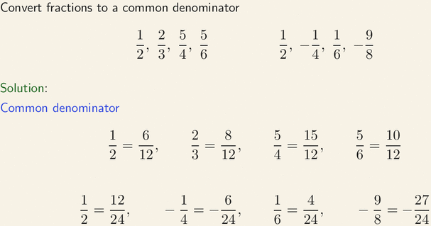 Exercise: Convert fractions to a common denominator: 1/2, 2/3, 5/4, 5/6; 1/2, -1/4, 1/6, -9/8.