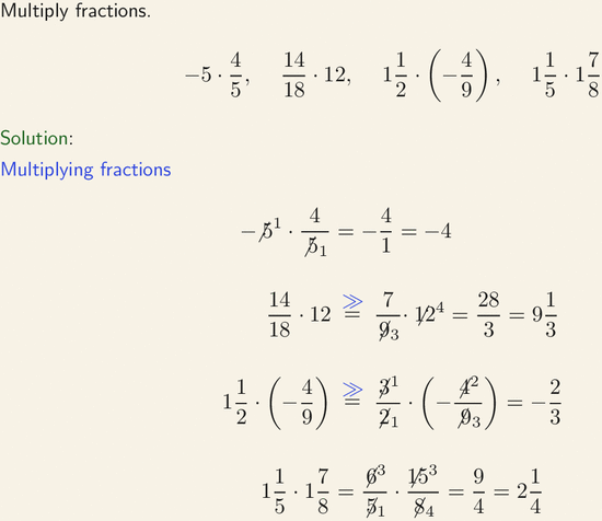 Multiply fractions: -5 * 4/5, 14/18 * 12, 1 1/2 * (-4/9), 1 1/5 * 1 7/8.
